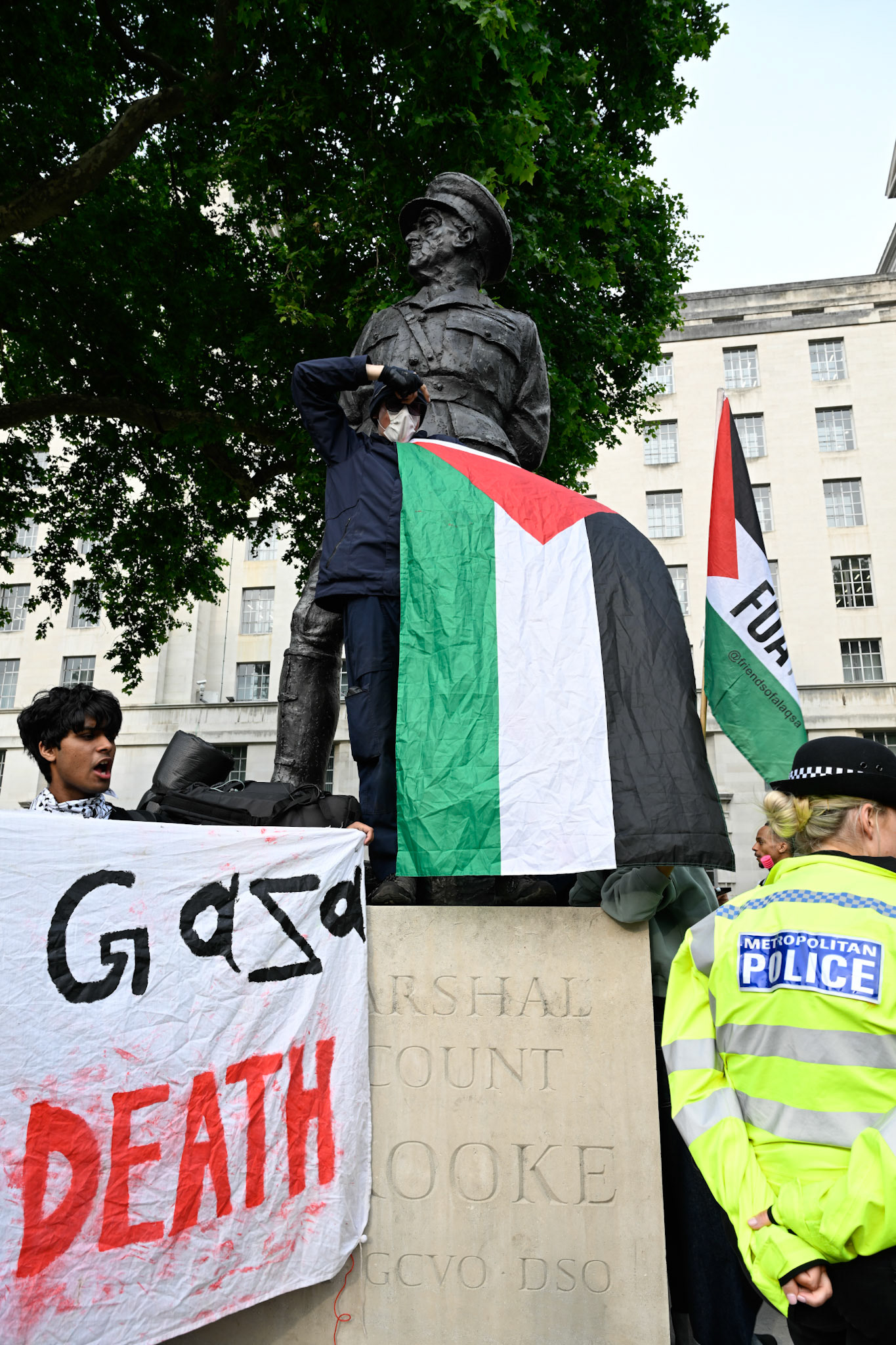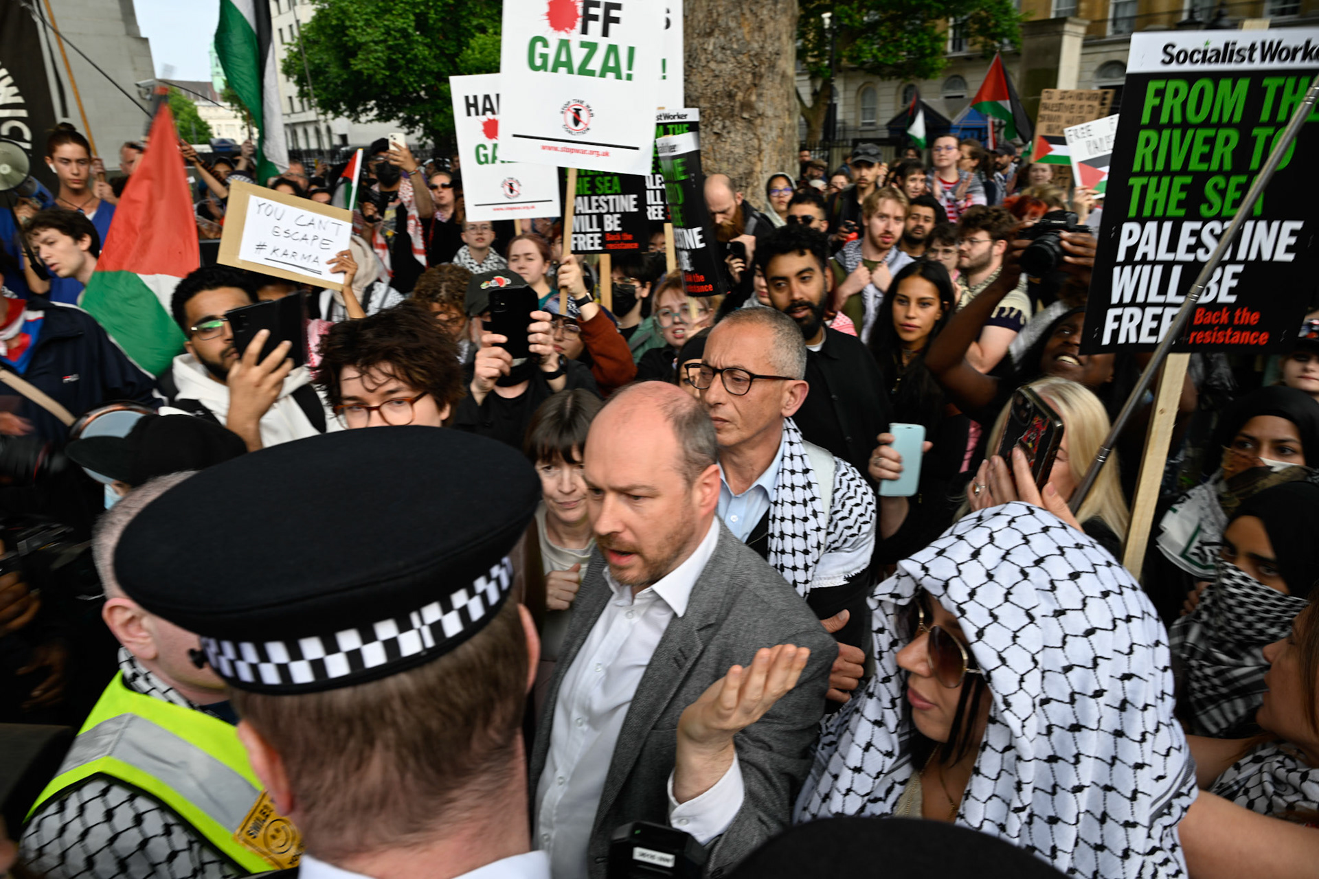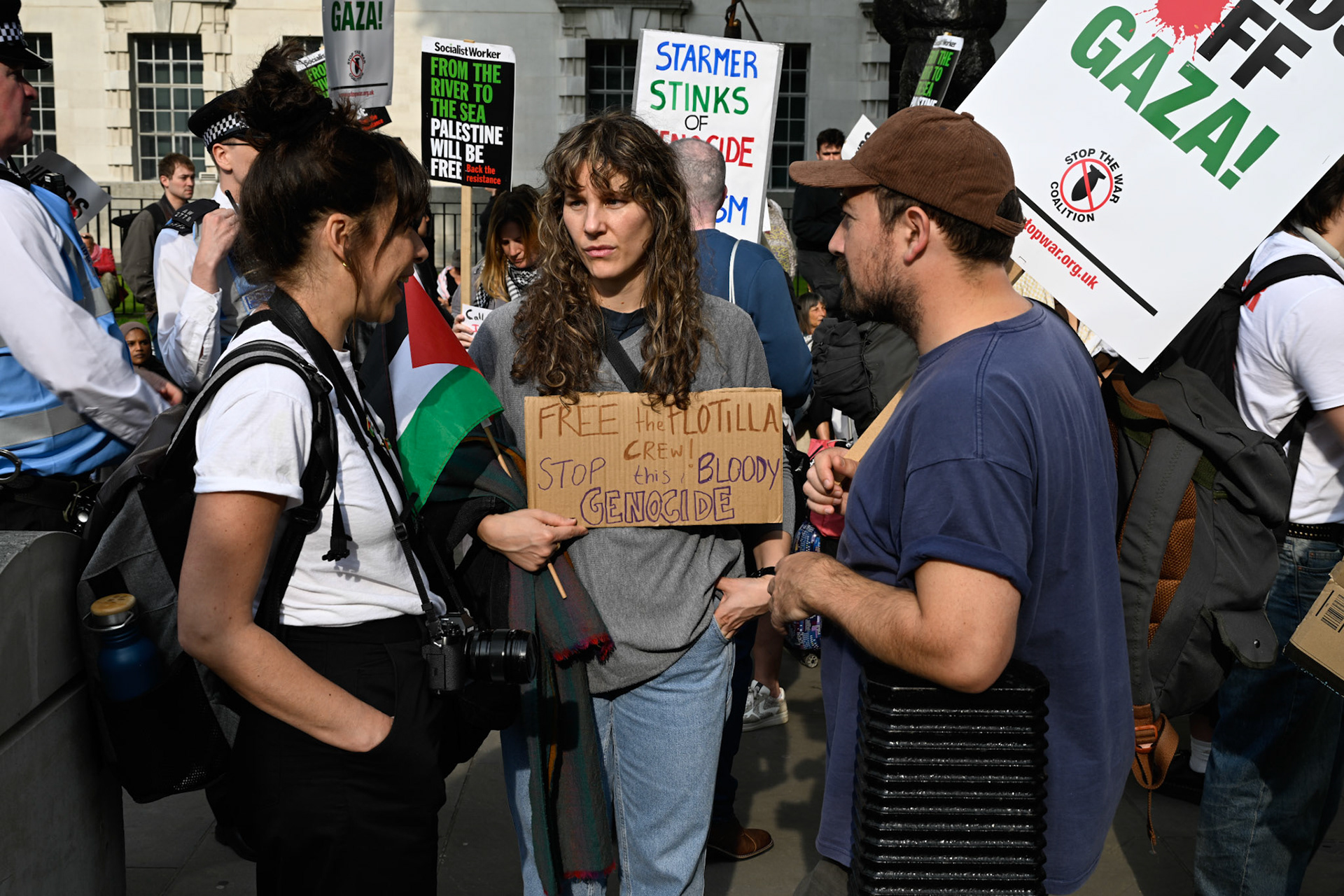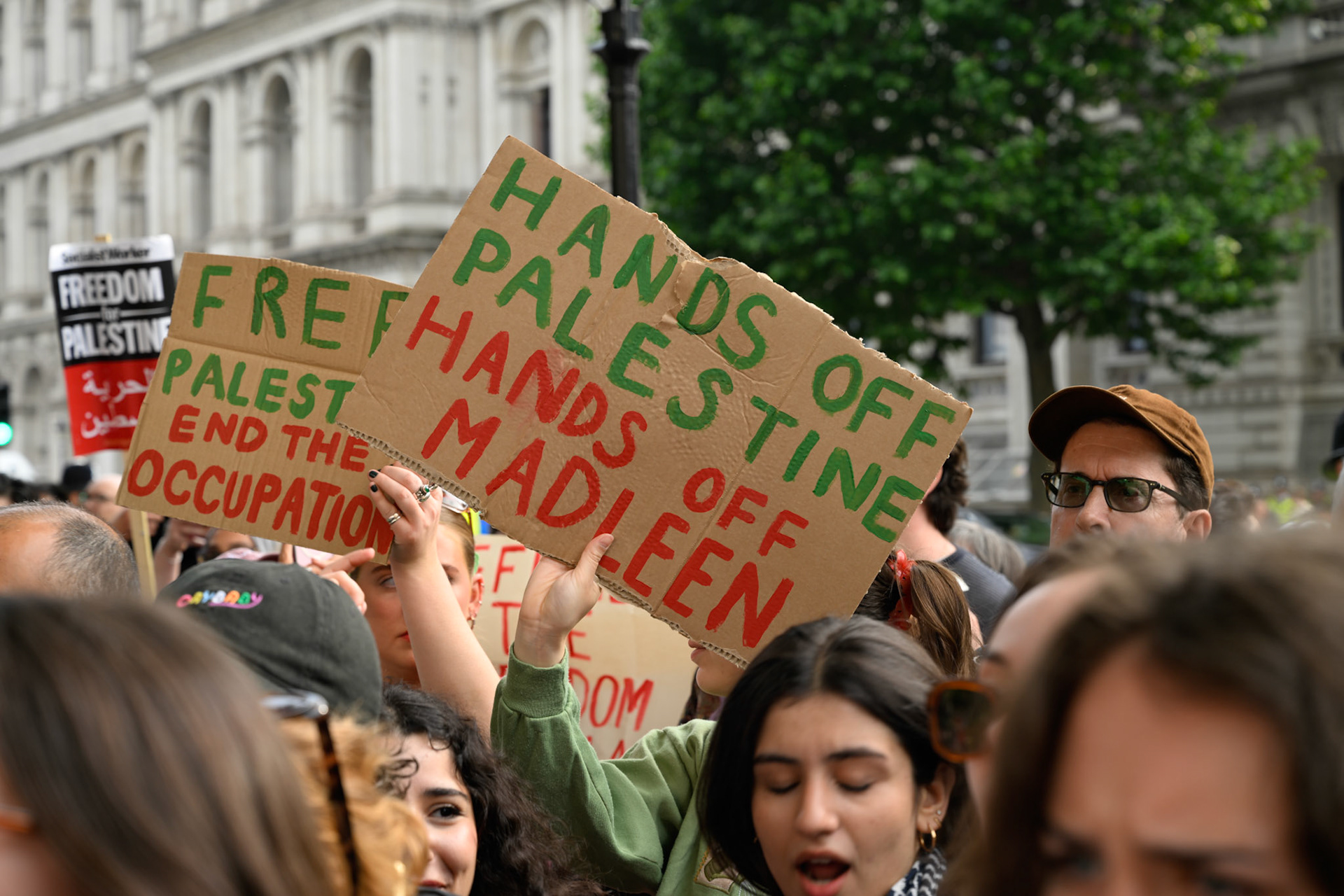 A protest opposite Downing Street in support of Greta Thunberg and colleagues on the Freedom Flotilla Coalition vessels attempting to bring humanitarian aid to Gaza that were ceased by the IDF and escorted to Israel